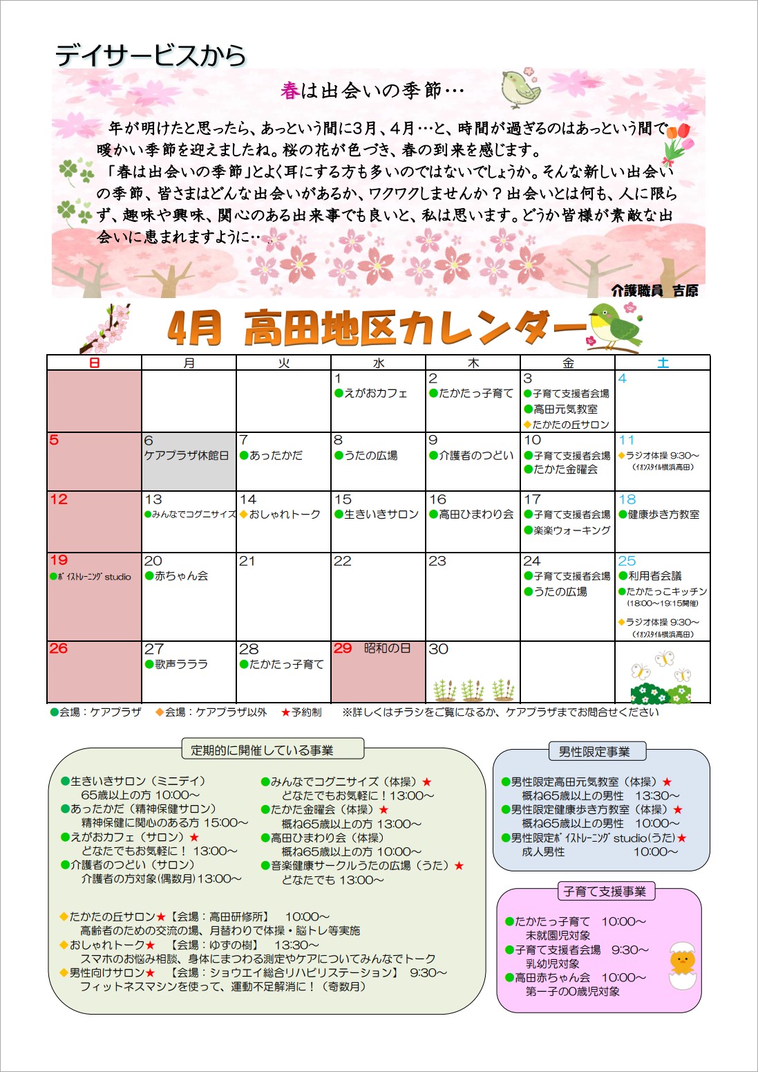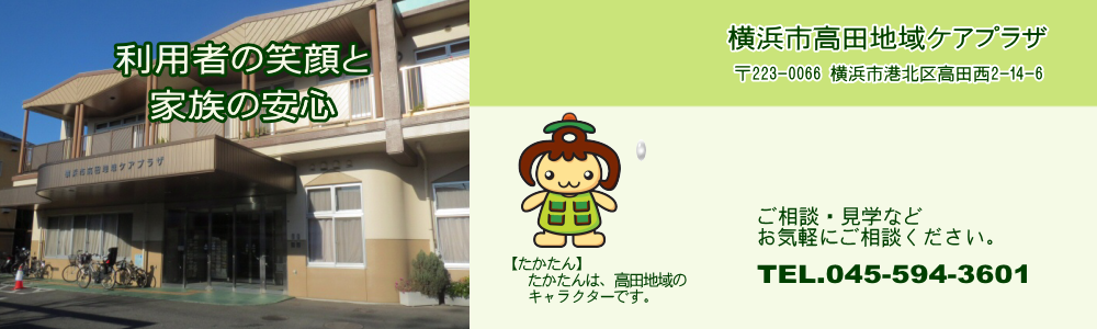 横浜市高田地域ケアプラザは、各部門各職種の職員が、それぞれの専門性を活かしながら連携し、高田が安心して暮らせる街であり続けるよう、地域の皆様とともに各種事業に取り組んでまいります。